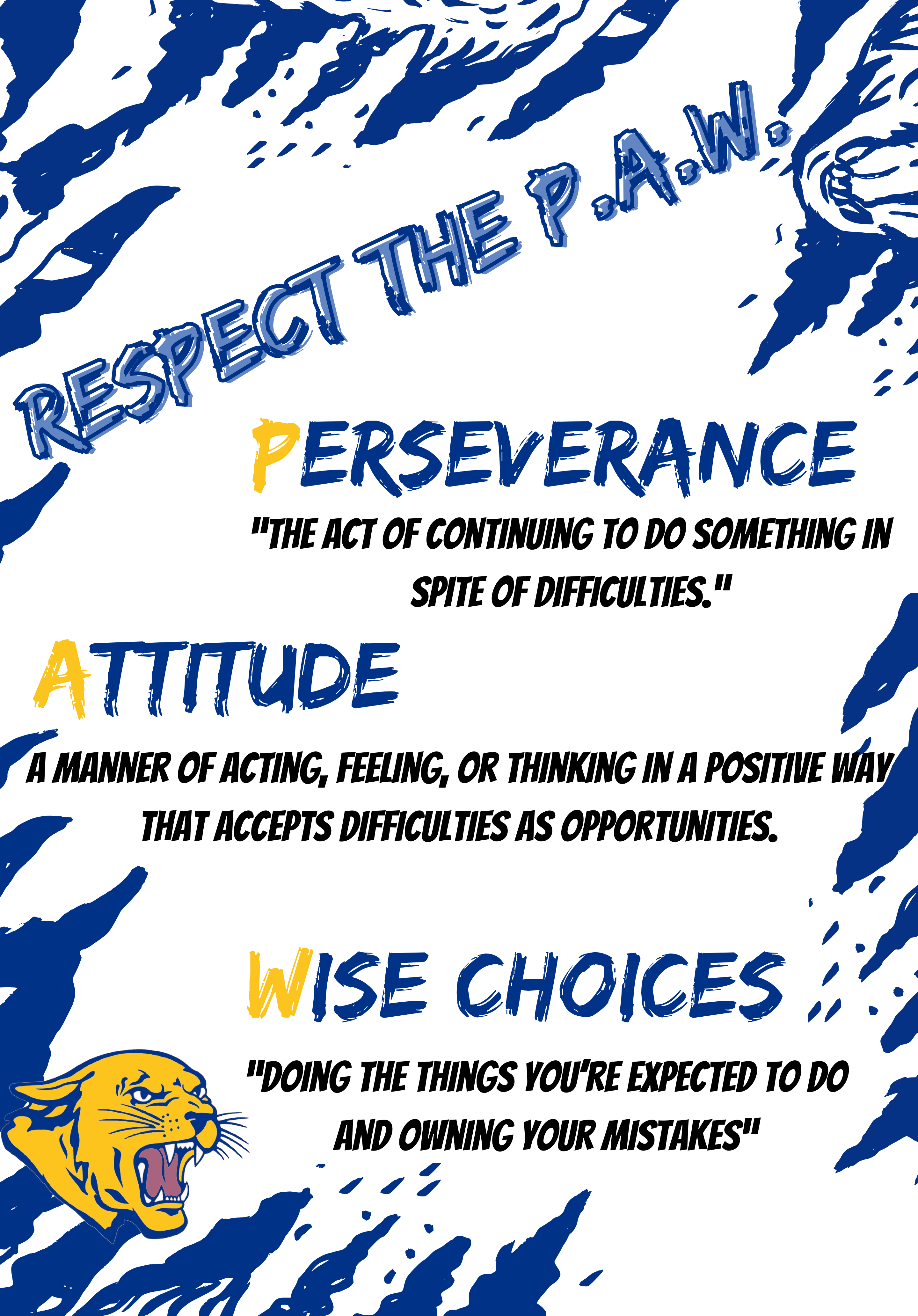 This picture explains the elements of the school wide expections known as PAW.  Perseverence, Attitude, Wise Choices
